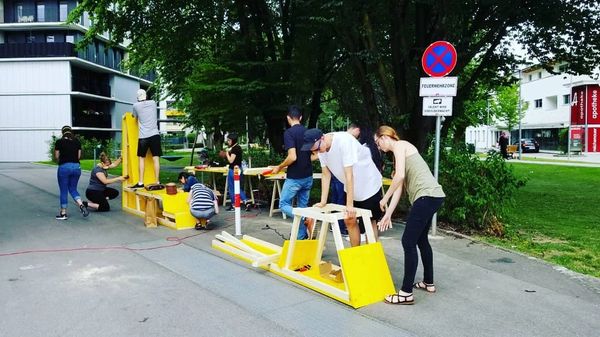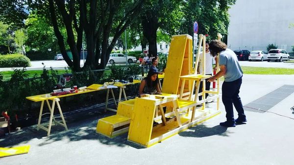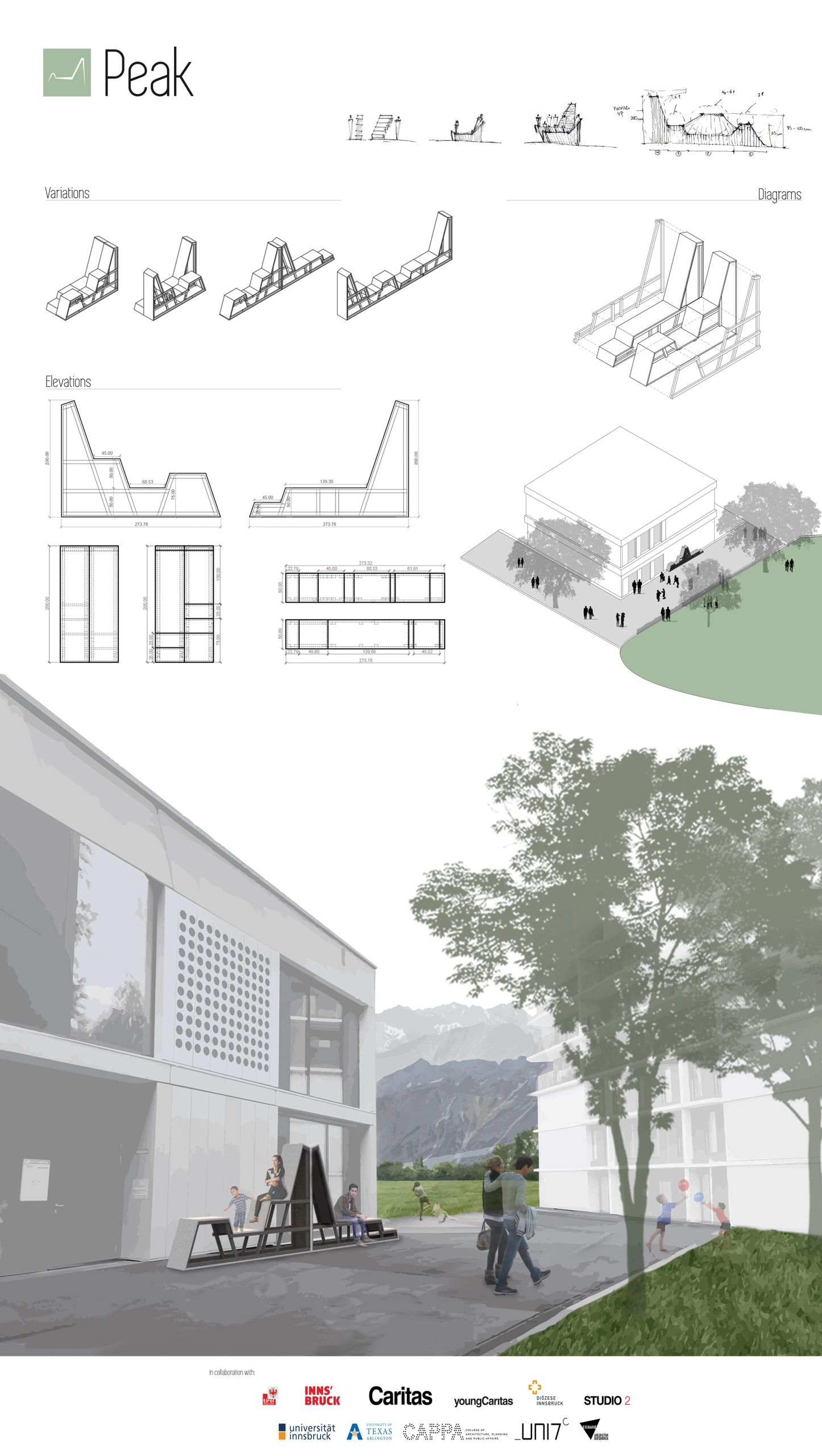 During a summer course in Innsbruck, our class was commissioned to design and build a seating arrangement for a local community center. The design is based on the mountain range around the city, “Peak”, was designed and built in two weeks.