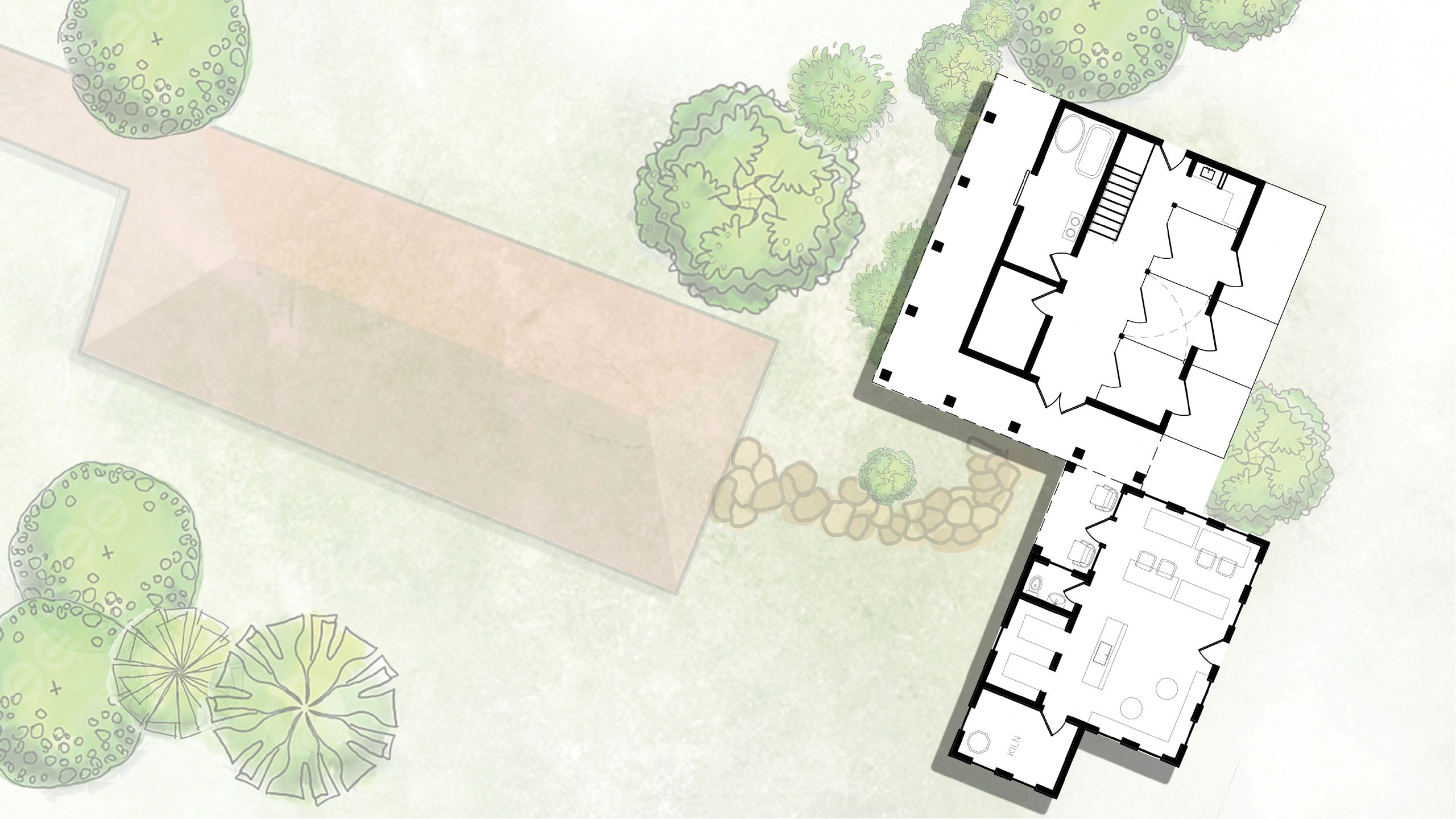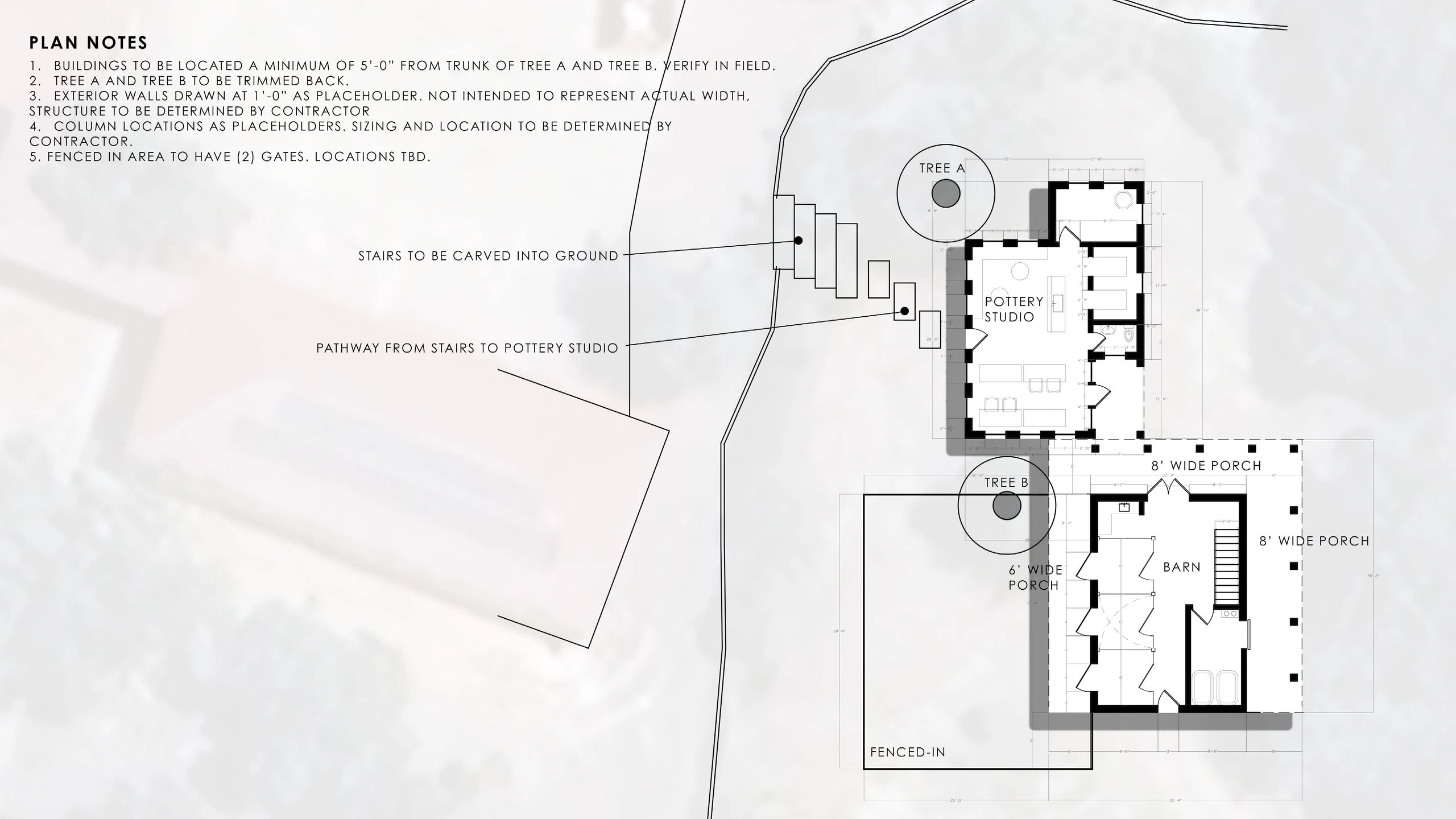 Designed for a ranch in Austin, Texas. A barn and pottery studio will sit on a plinth overlooking the residence. The barn and pottery studio will use design elements from the original house, including stone that has been removed from demolished properties on the ranch. This project has been designed around two existing large oak trees. These will provide shade to the future donkeys inhabiting the barn and shade for the southen windows of the pottery studio to provide passive cooling in the hot Austin summers.