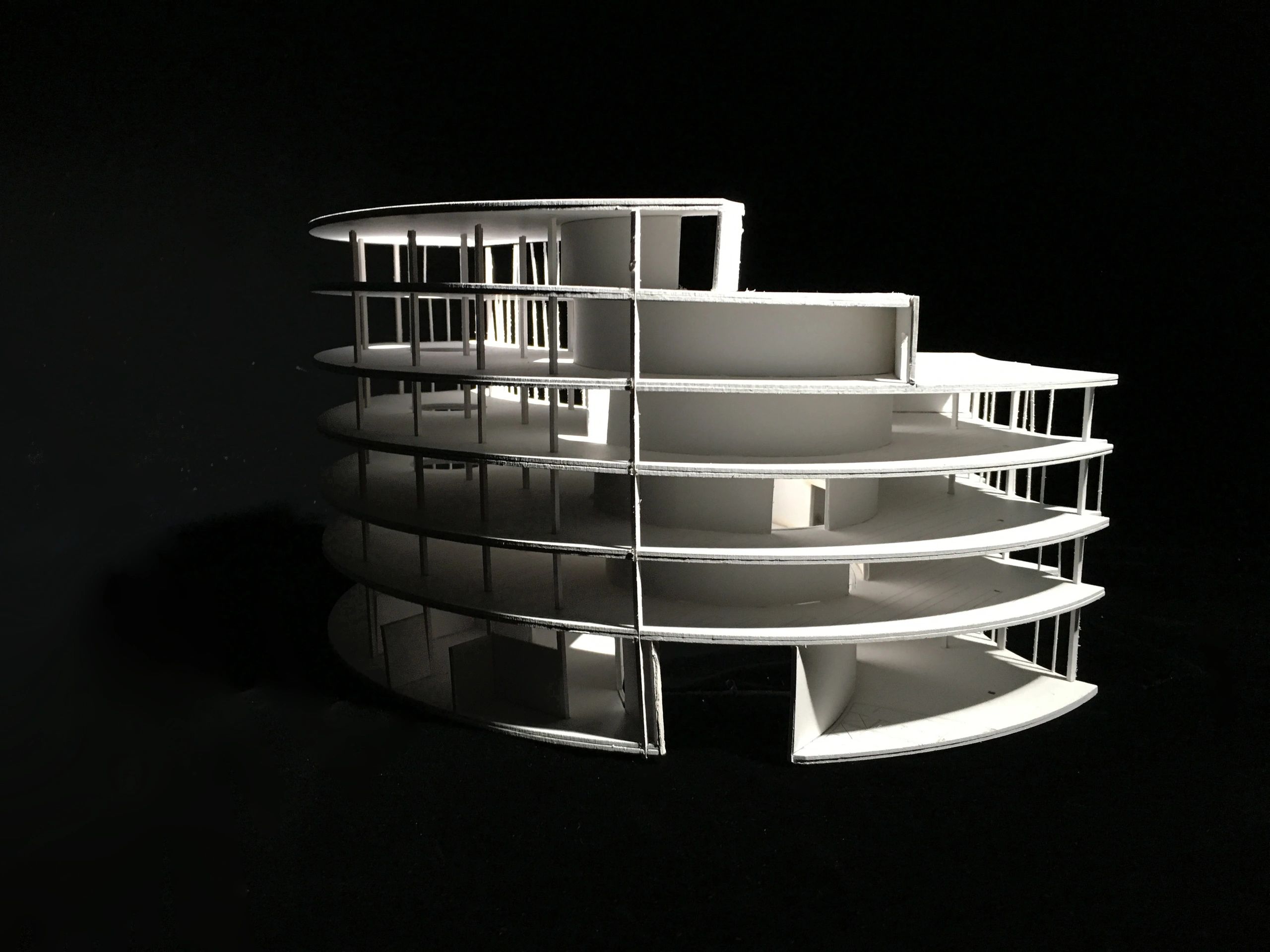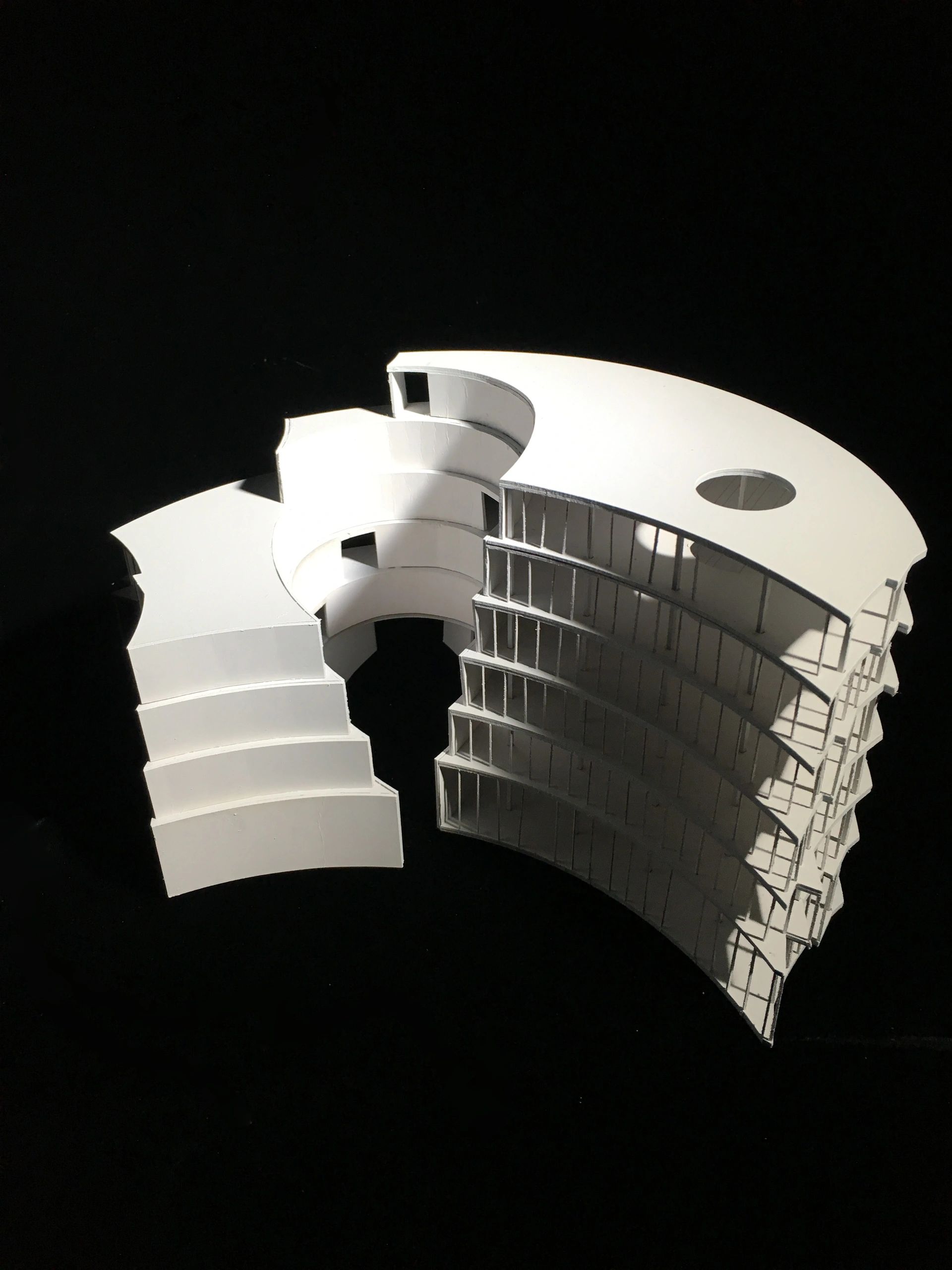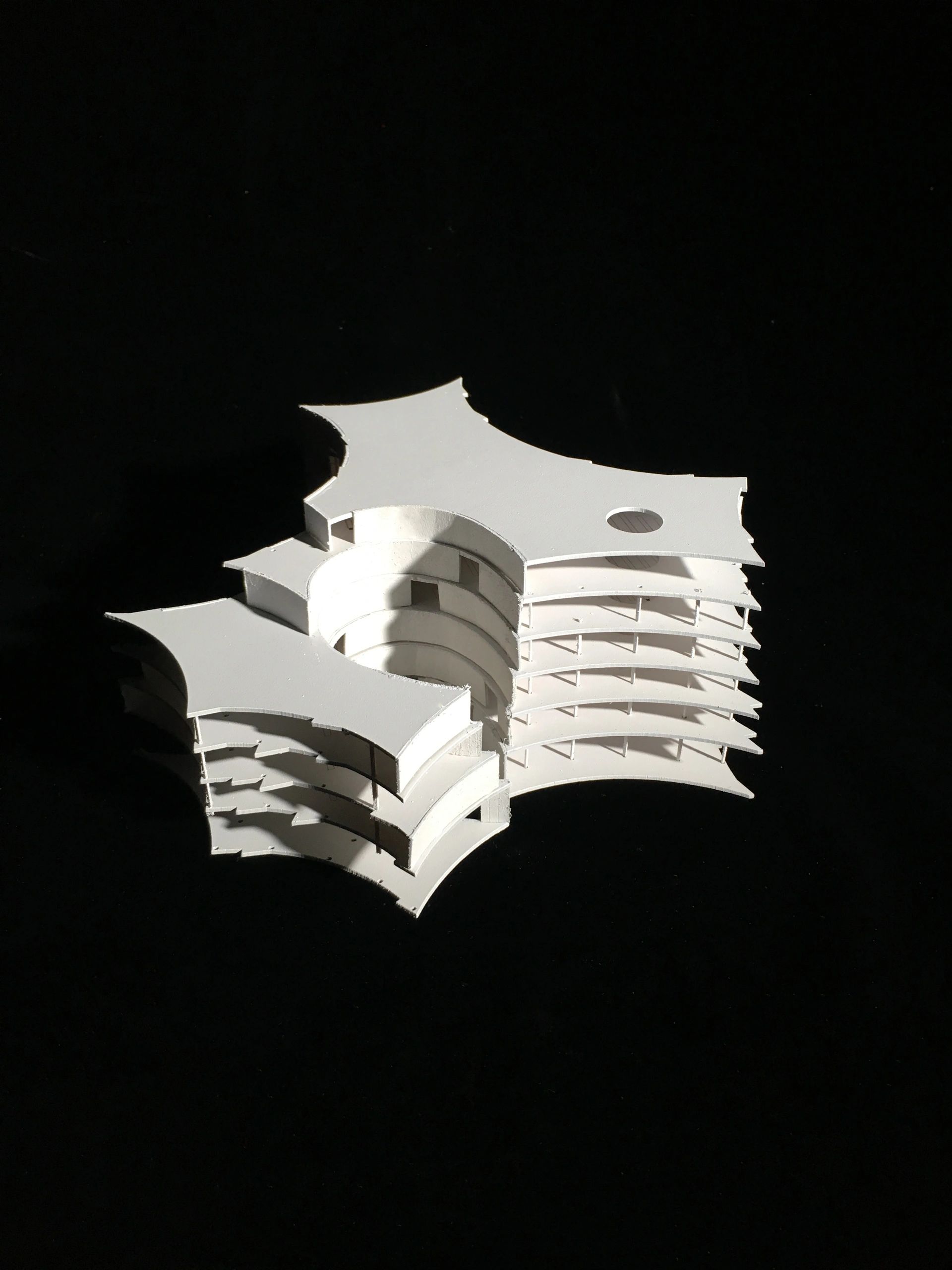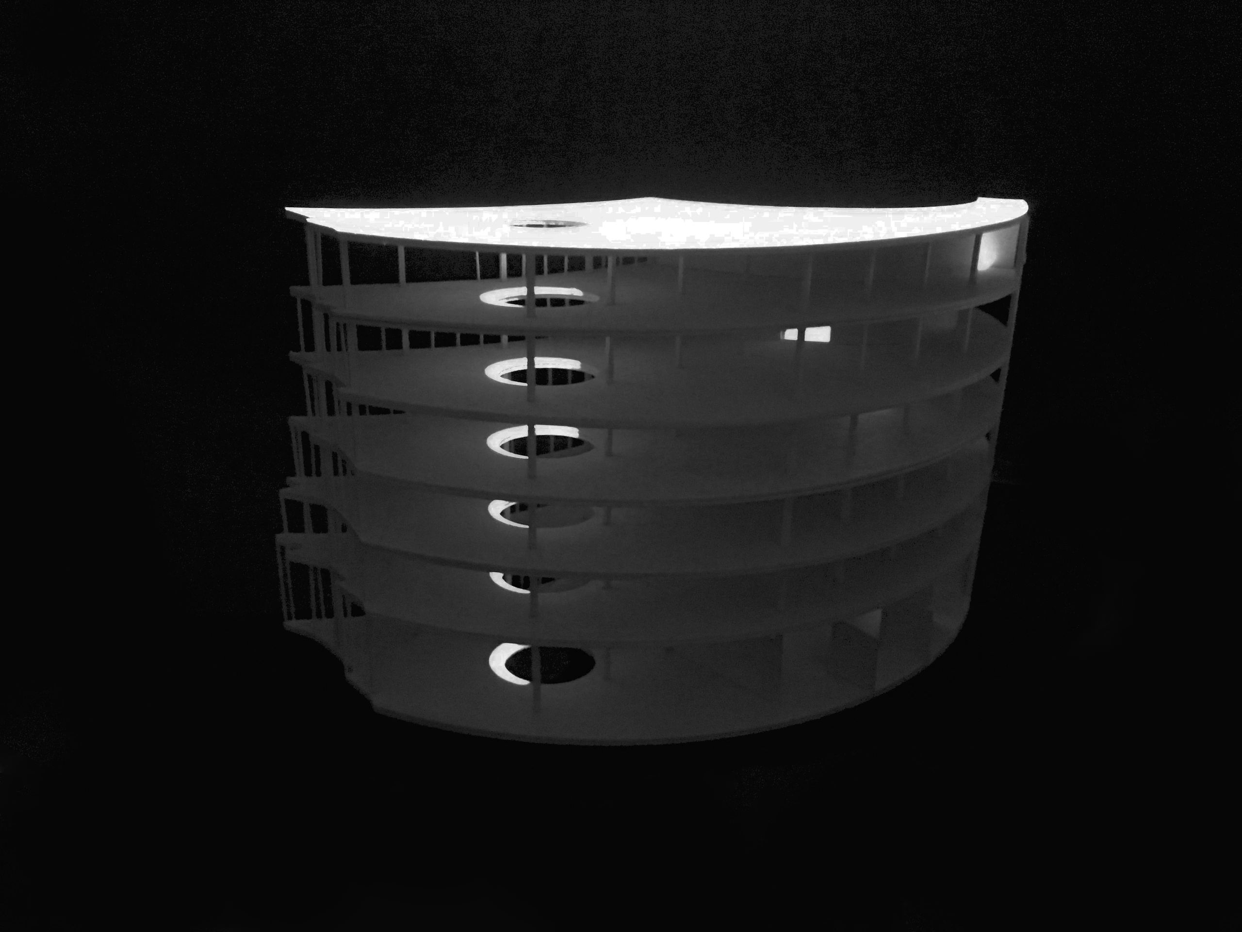 The facade was designed based on its location in reference to the sun. The south side is comprised of sporadic windows where as the north east side is entirely glass. In addition the southern side is higher than the northern side, to flood the courtyard with morning light while simultaneously blocking the harsh afternoon rays.